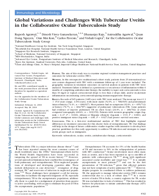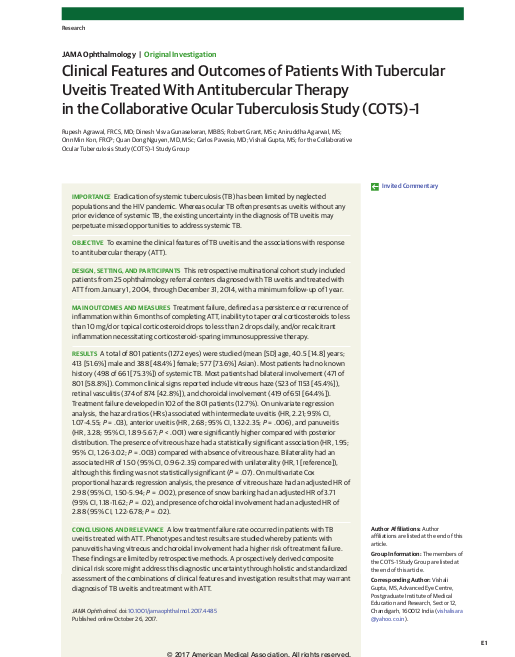 Information on clinical features, investigation findings, management and treatment outcomes were reviewed to get an idea about real world scenario. The mean age of presentation was found to be 41.3 with predominance of males (52.9%), Asian ethnicity (74.4%) and Asian geographical origin (61.5%); consistent with previous reports. Only 23.3% showed any known history of systemic TB at the time of diagnosis of ocular TB. Overall, it emerged that PCR was not a commonly used tool in COTS-1 and it was performed only in a small subset of patients. Diagnostic and management uncertainties highlighted by the study raise the need for future prospective studies to better assess ocular TB clinical features and to enhance the study of management and treatment outcomes of ocular TB through standardized recruitment and treatment protocol. To date, there are no randomized controlled trials that have defined the diagnosis nor the management of ocular TB. Furthermore, there are no consensus guidelines among the uveitis experts regarding the treatment of ocular TB, including duration of ATT, ATT regime and also regarding the concurrent use of oral corticosteroids and immunomodulatory therapy (either systemic or local). In addition, there is no multicenter study on TB that highlights differences in practice across the globe.