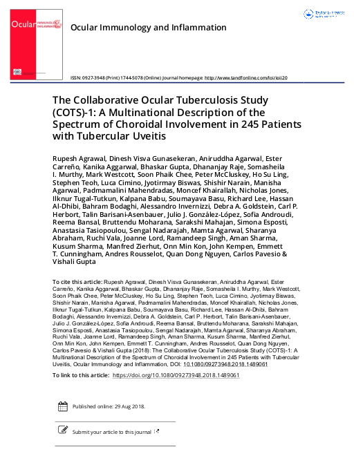 Collaborative Ocular Tuberculosis Study (COTS)-1 addressed the knowledge deficits through collaboration amongst uveitis specialists across the globe by sharing the data of patients with ocular TB presented at participating centers from January 2004 to December 2014. Data collection was facilitated by a novel method of real-time encrypted web-based data entry allowing regular updates as new data and recommendations become available.